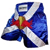 Pantaloncini da boxe Thai / kick realizzati in pregiato raso di alta qualità. Ottima fattura (fatta a mano). Shorts bianchi con simbolo Bulls sul davanti con strisce blu. Con ampia fascia elastica in vita e spacchi laterali per una vestibilità perfetta. Allacciatura all'interno. Misura speciale per calci alti e calci al ginocchio.