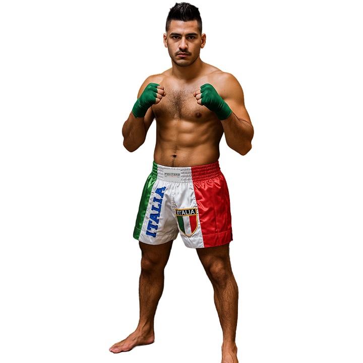 Pantaloncini da boxe Kick / Thai in raso di alta qualità. Ottima fattura (fatta a mano, fine satin). Verde - Bianco - Pantaloncini a righe rosse con stemma italiano e scritta ITALIA. Con ampia fascia elastica in vita e spacchi laterali e allacciatura all'interno per una vestibilità perfetta. Taglio speciale per calci alti e alle ginocchia.