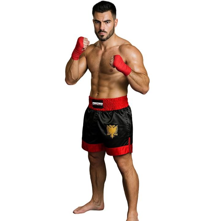 Shorts Kick- / Thaiboxing realizzati in raso pregiato di alta qualità. Ottima fattura (fatta a mano). Pantaloni Thai neri con cinturino rosso e stemma a doppia testa giallo dorato. Con ampia cintura elastica e spacchetti laterali per un perfetto comfort. Allacciatura all'interno. Taglio speciale per calci alti e ginocchia.