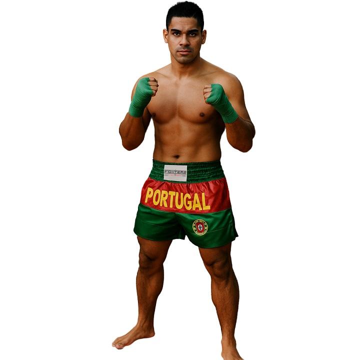 Pantaloncini da boxe Kick / Thai in raso di alta qualità. Ottima fattura (fatta a mano, fine satin). Pantaloncini a righe verdi / rossi con iscrizione Portogallo e stemma portoghese. Con ampia fascia elastica in vita e spacchi laterali e allacciatura all'interno per una vestibilità perfetta. Taglio speciale per calci alti e alle ginocchia.