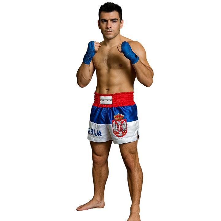 Pantaloncini da boxe Kick / Thai in raso di alta qualità. Ottima fattura (fatta a mano, fine satin). Pantaloncini tailandesi colorati rosso / blu / bianco con stemma della Serbia e iscrizione SRBIJA. Con ampia fascia elastica in vita e spacchi laterali e allacciatura all'interno per una vestibilità perfetta. Taglio speciale per calci alti e alle ginocchia.